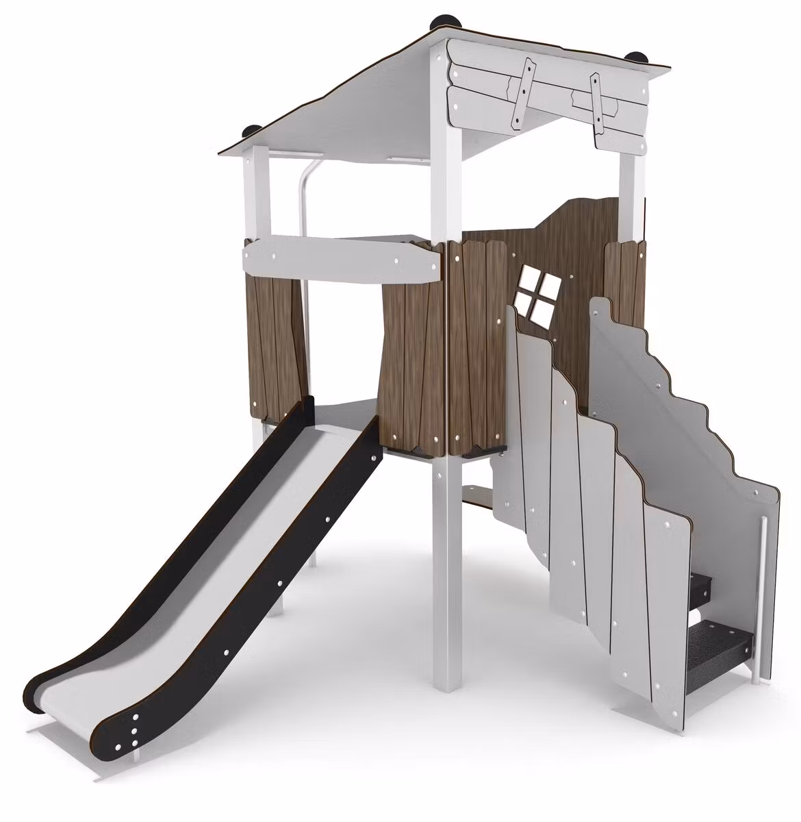 Rutschkana, trappa, brandmansstång med steg, bänk och fönster. Rostfritt stål och HPL.
