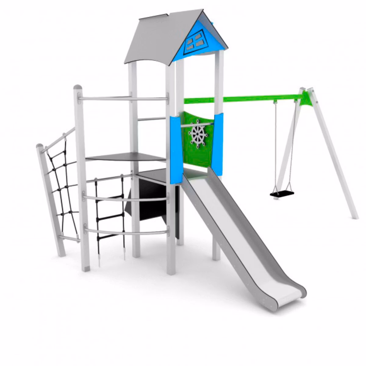 Aktivitetstorn med tak och gunga, rutschkana, klätterpanel, klätternät och klätterstegar. Vid installation ska alltid den medföljande manualen användas.