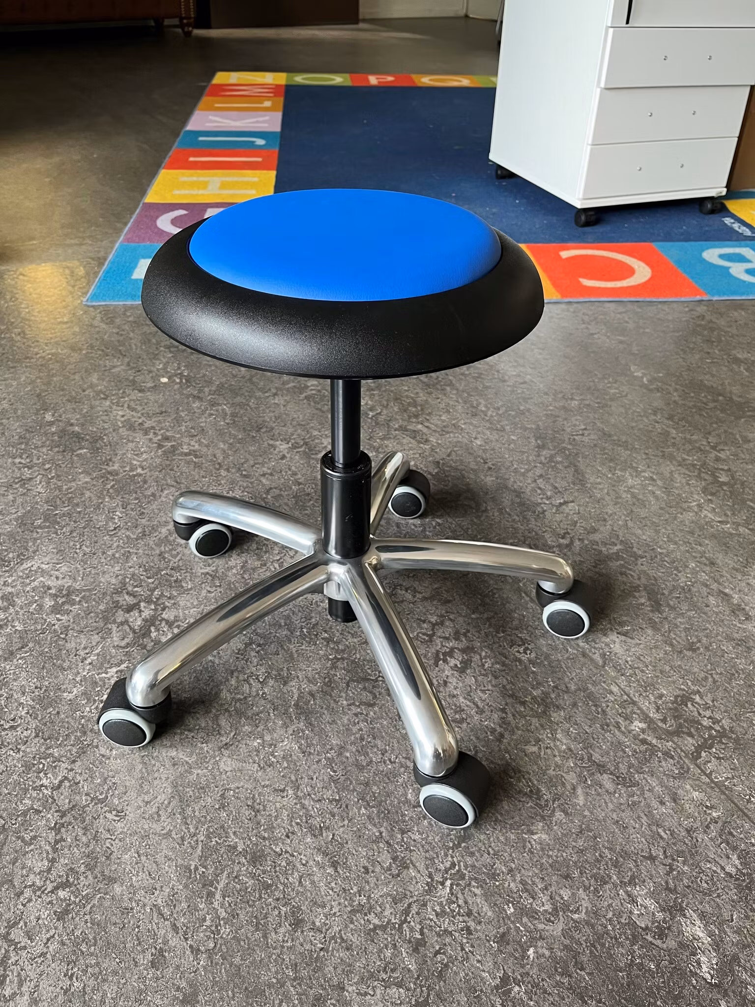 Bekväm och ergonomisk åkstol. Ställbar sitthöjd 35–44 cm. Totaldiameter på sits 32 cm. Totaldiameter på fotkryss 55 cm. Sits i konstläder med stoppning.