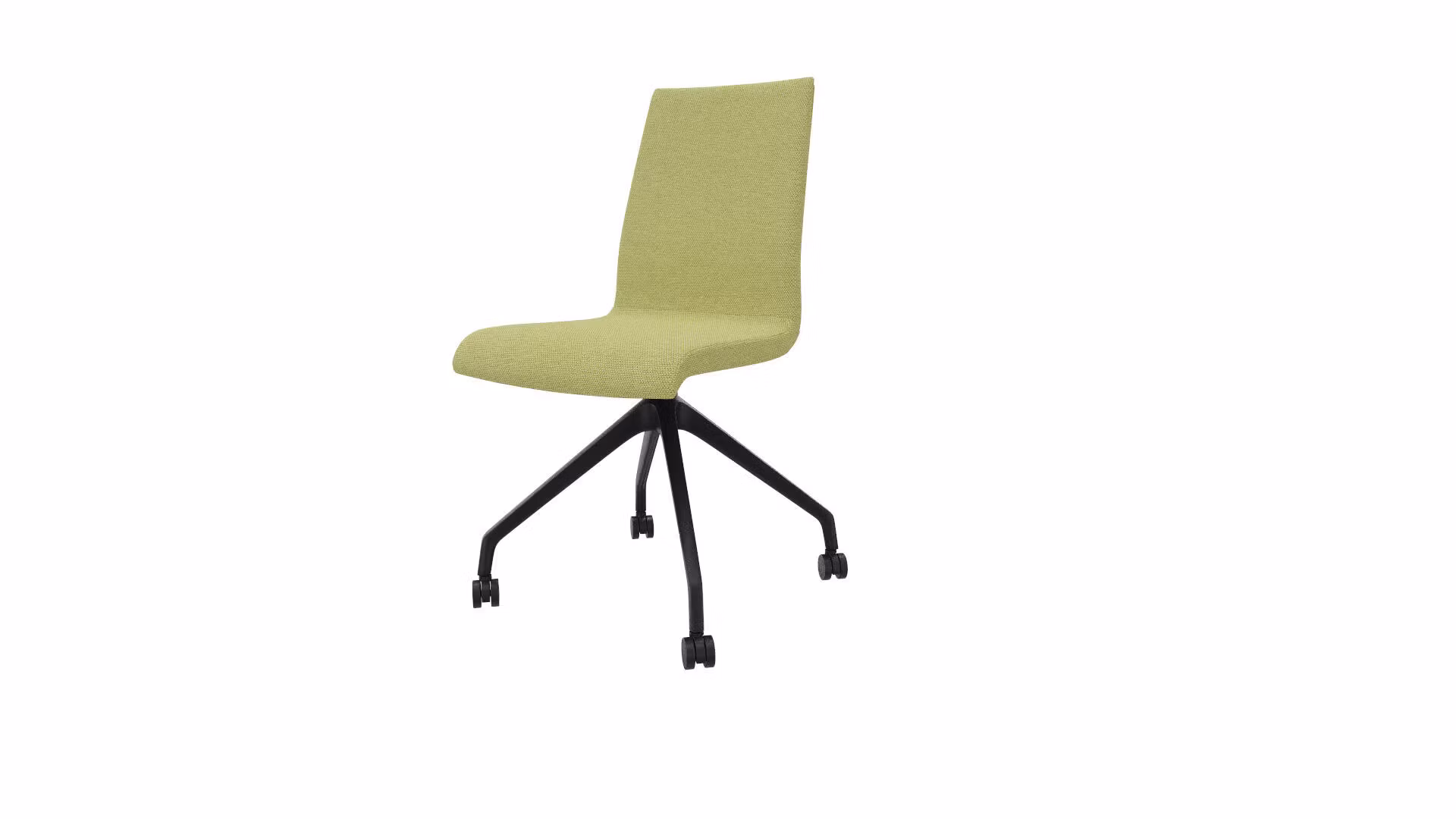 Konferensstol Apollo med slät, medelhög rygg. Sittdelen är av formpressad faner med kallskum, klädd i tyg Era. Svart nylonkryss med 4 armar med hårda hjul för m