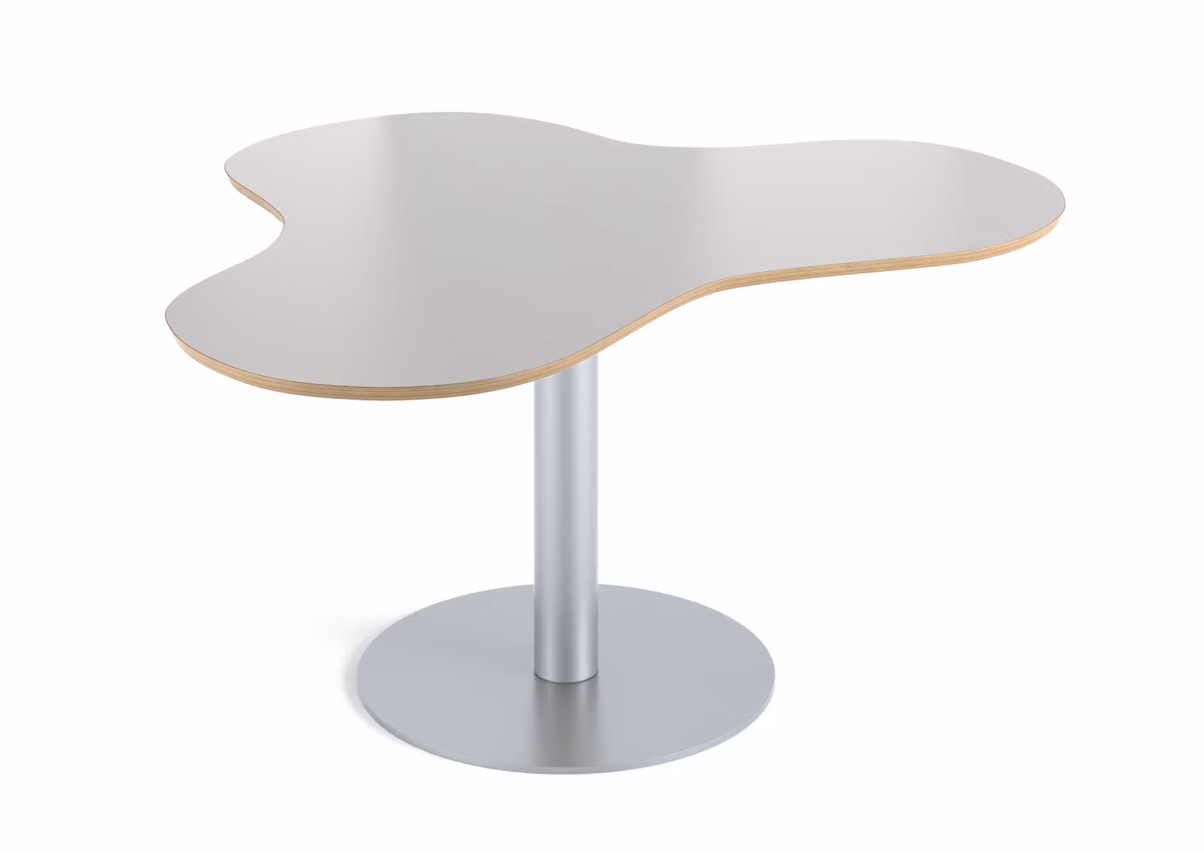 Praktiskt bord i klöverform som gör att många får plats. Passar bra t.ex. i ett makerspace. Skiva i ljusgrå  laminerad plywood. Stativ i RAL 9006.