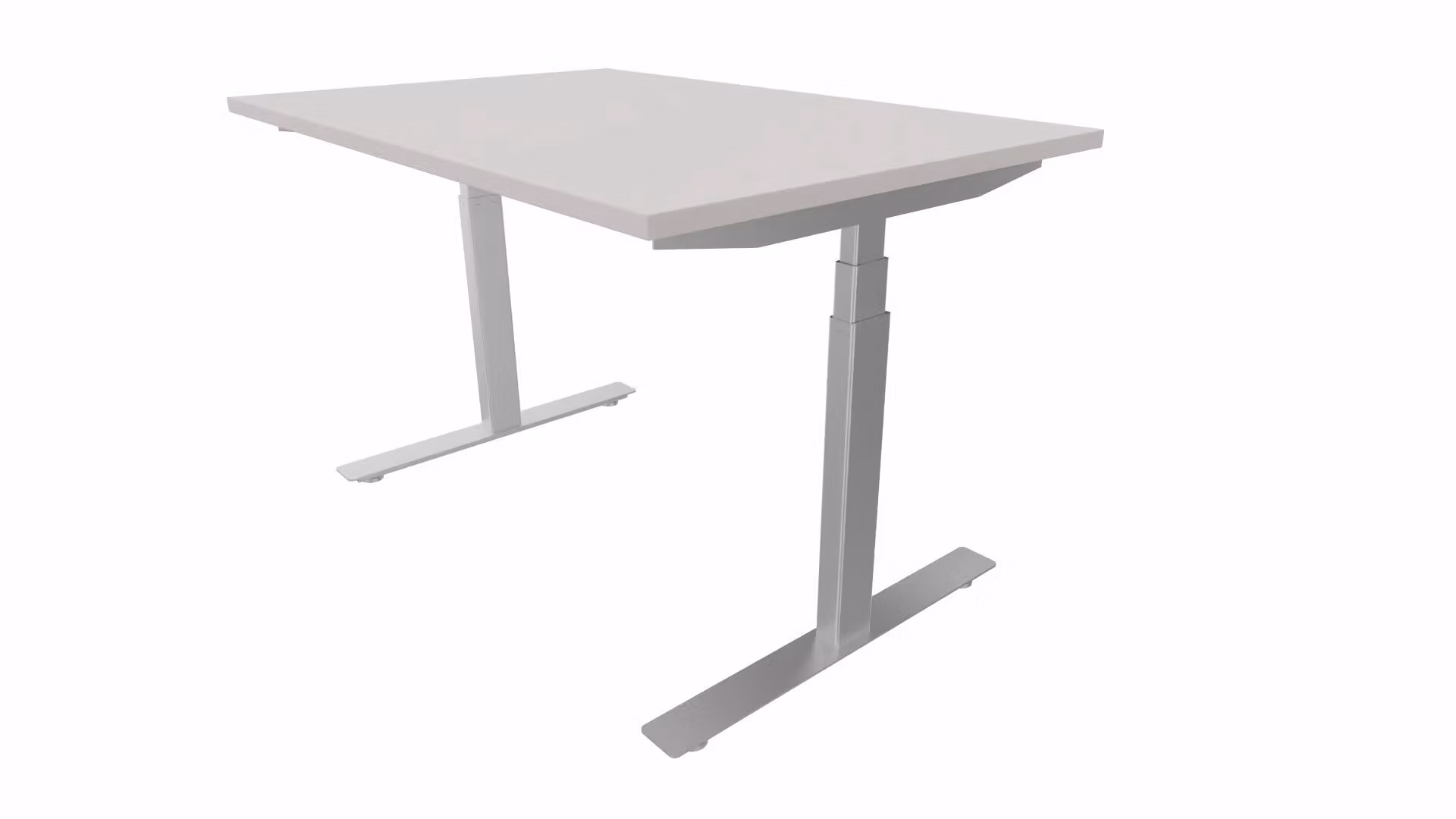 Bordsskiva i ljusgrå direktlaminat med ABS-kant. Höj- och sänkbart stativ (60,5-125,9 cm) som drivs med elmotor. Ställbara fötter för ojämnt underlag. Mått fot: L71xB6 cm.